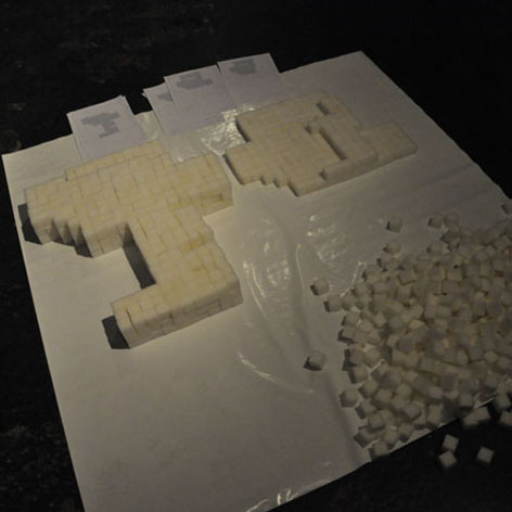 Le Confort Moderne est reconstitué par les participants à l'aide de 1252 cubes en mousse.